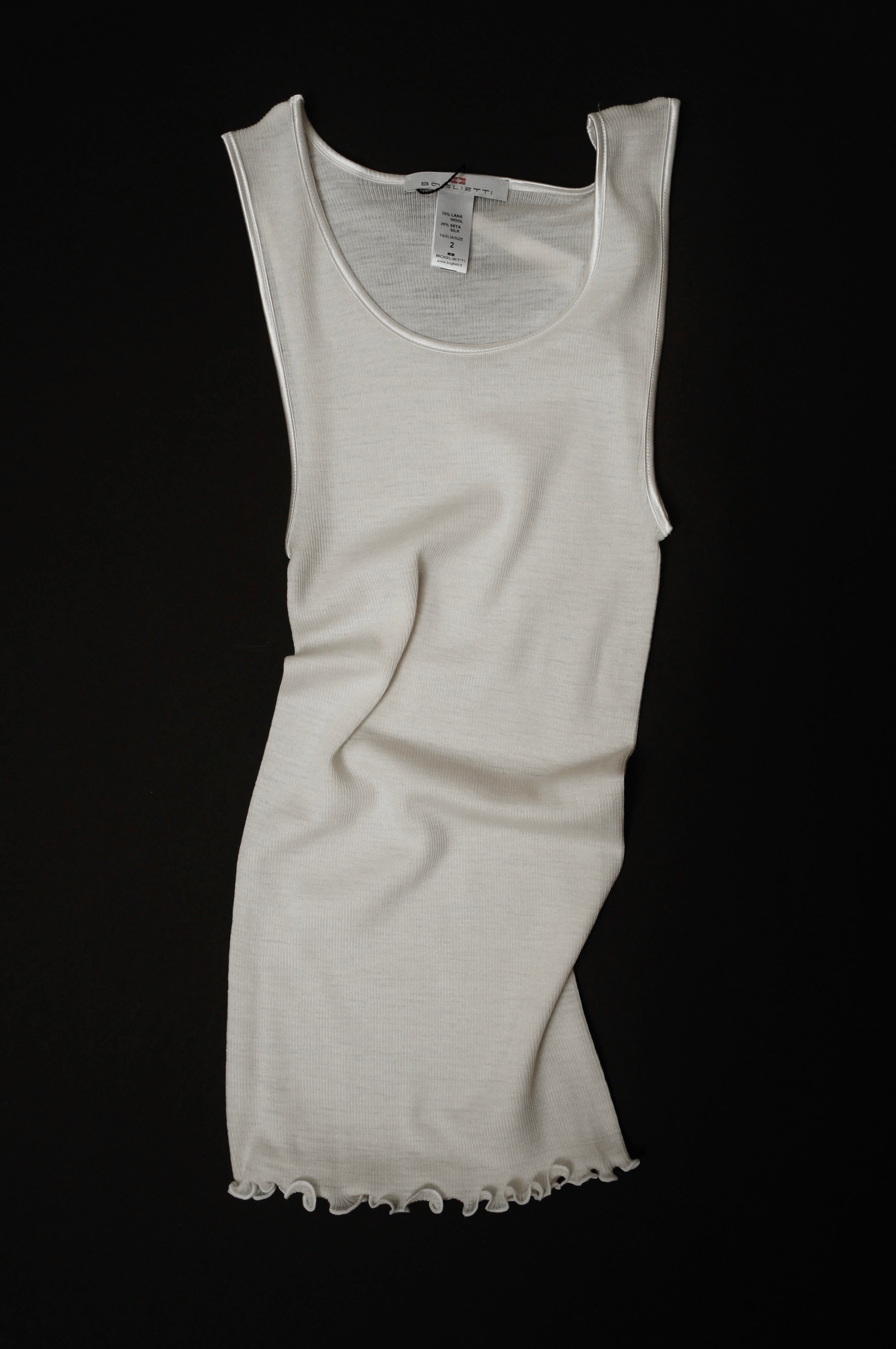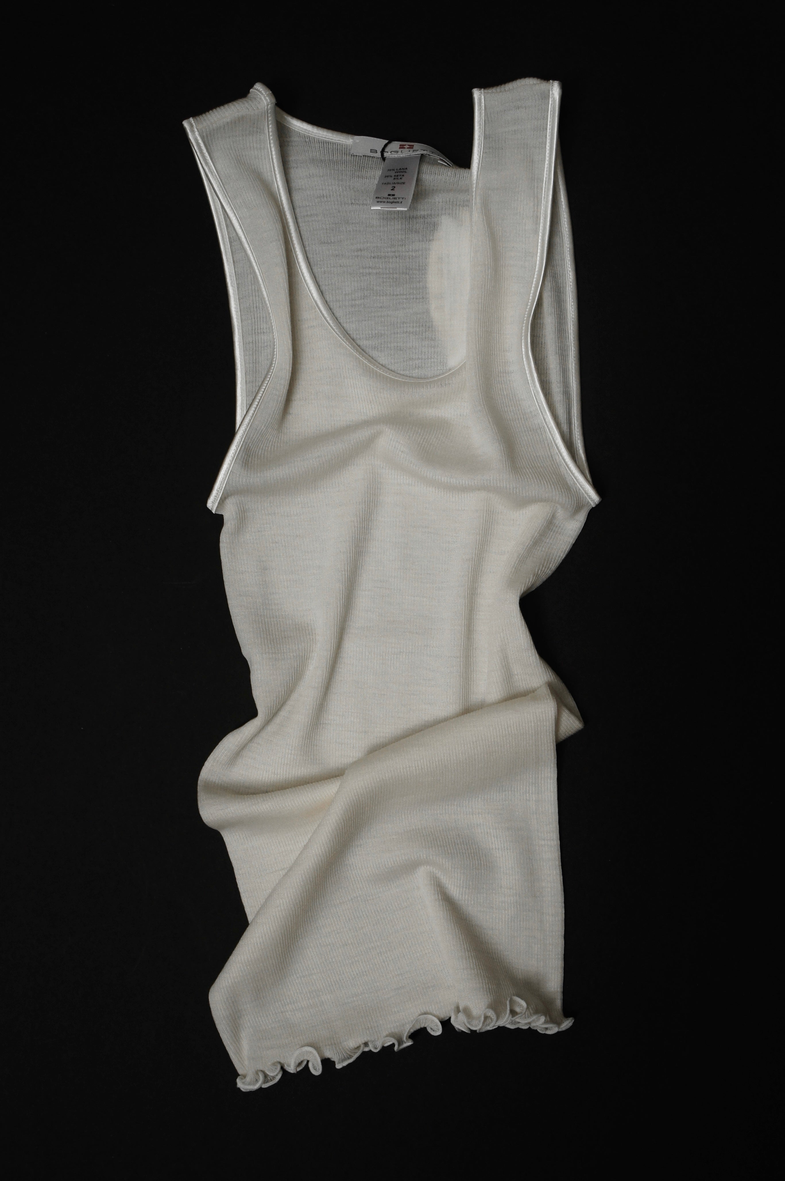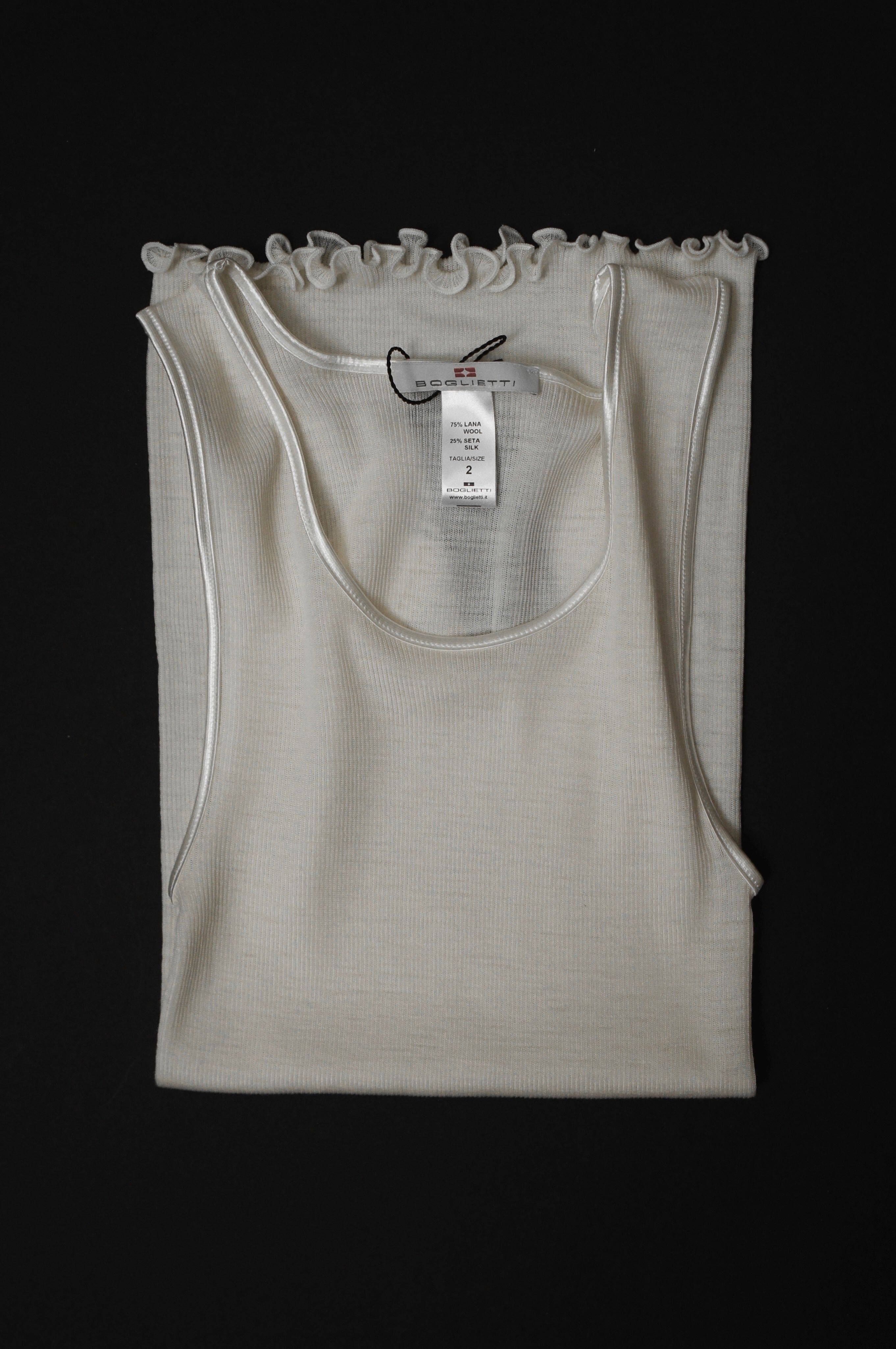 Finely ribbed top with wide straps, made from a fine blend of wool and silk. The fabric gently embraces the body, offering exceptional comfort. Its natural elasticity allows it to softly follow the silhouette, highlighting the natural curves.