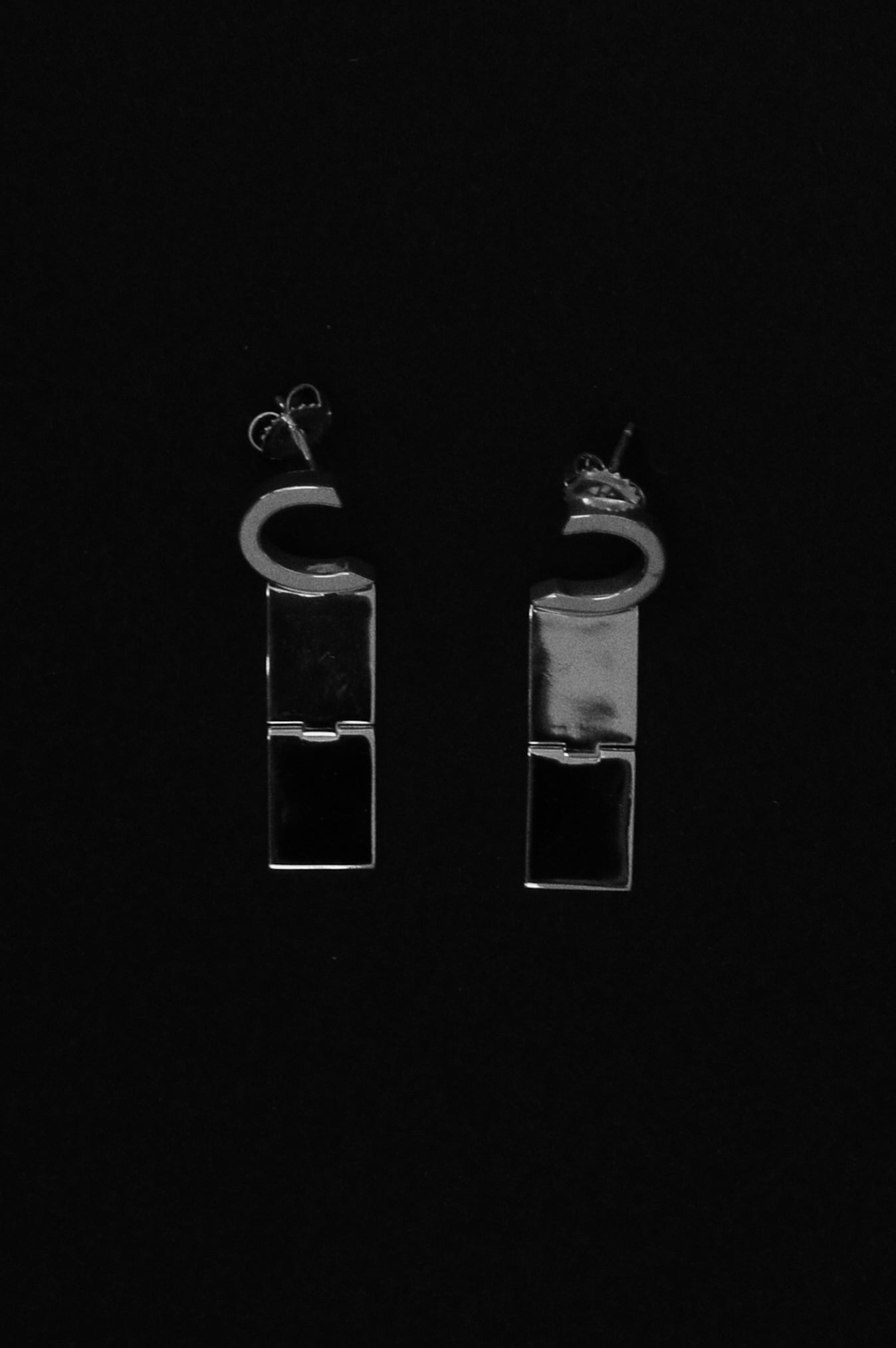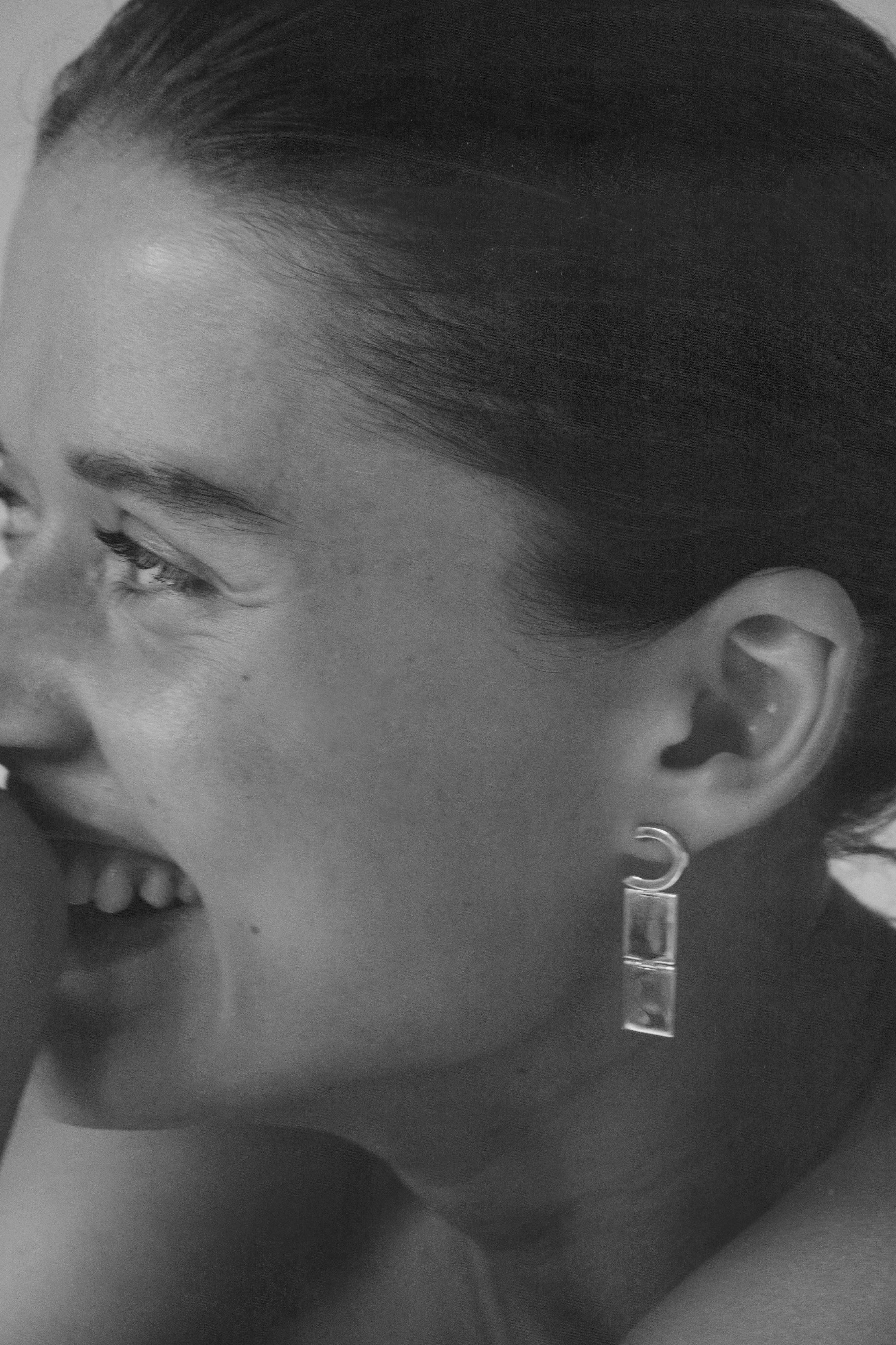 Handcrafted Curva earrings, made from recycled 925 sterling silver. Their sculptural form, defined by a distinctive shape and a subtle hinge, allows for gentle opening and closing. Each piece may vary slightly in its details, a natural result of handcrafting.